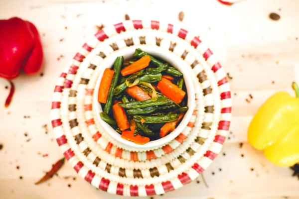 String beans, carrot, onion, garlic and ginger.