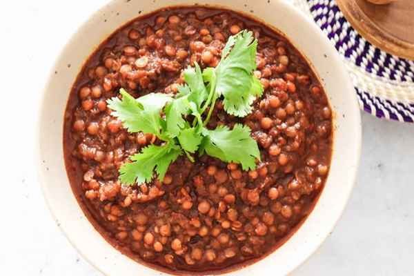 Lentils cooked with onions, garlic and spicy red sauce.